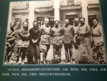 此处有一张十分珍贵的照片。1941年5月,陈毅在视察江淮日报时和新四军干部的留影。右起:曹荻秋、陈毅、刘瑞龙、彭康、沈其震、罗生特、徐波、王澜西、徐进。这张照片上多人一九四九年后担任着中央或地方党政重要职务,如:陈毅(一九四九年后上海市第一任市长、元帅、国务院副总理兼外交部长),曹荻秋(中共上海市委书记),刘瑞龙(中共上海市委秘书长),沈其震(中国医学科学院副院长),王澜西(文化部副部长)。