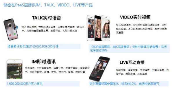 游密科技公司是国内领先的音视频通讯协同服务提供商,自主开发的游密通讯云为客户提供IM即时通讯、TALk实时语音、VIDEO实时视频、LIVE互动直播等产品和服务。