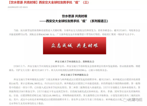 在疫情发生的第一时间,回馈母校最新上海校友会火线组织上海校友会热心志愿者,组成上海校友会医疗物资募捐小分队。连夜完成募捐文案,设立校友基金会捐款专项,近千位校友和社会爱心人士捐出善款,顺利完成募资目标。同时开展了一系列抗疫活动:校友基金会捐款专项、校友公益讲座、抗疫校友企业征集、海内外抗疫支援。校友们同心聚力、携手并进,坚守在自己的岗位上为抗击疫情做出贡献。