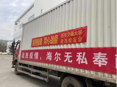 青岛校友会校友捐赠的防疫物资,正由专车运往创新港