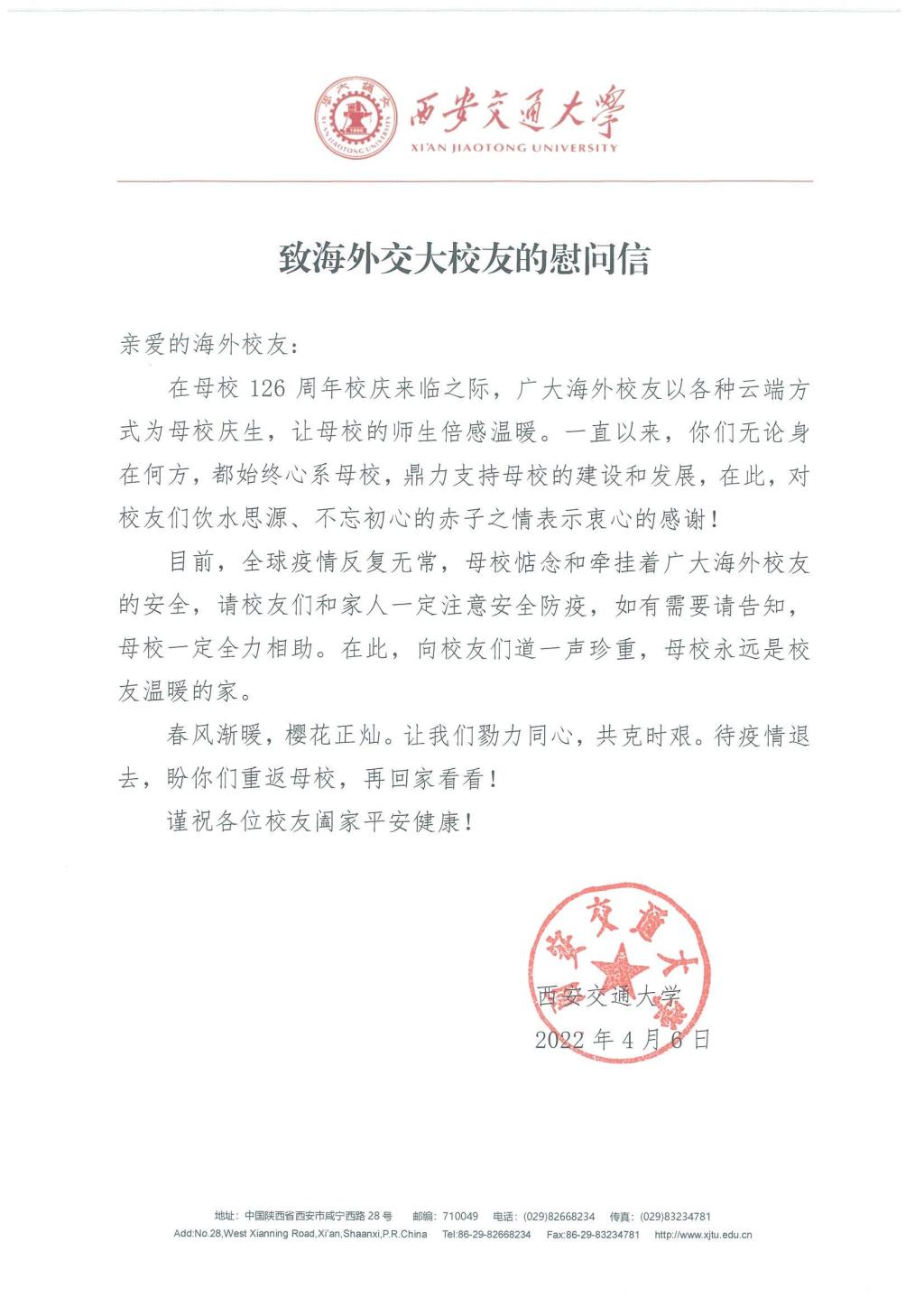 目前,全球疫情反复无常,母校惦念和牵挂着广大海外校友的安全,请校友们和家人一定注意安全防疫,如有需要请告知,母校一定全力相助。在此,向校友们道一声珍重,母校永远是校友温暖的家。