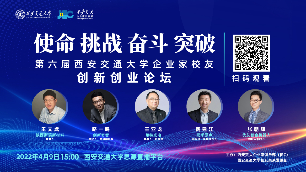 4月9日,由校友部和西安交大企业家俱乐部(JEC)联合主办的以“使命 挑战 奋斗 突破”为主题的“第六届西安交大企业家校友创新创业论坛”举行,论坛采用视频录播的形式在回馈母校最新思源直播平台播出。截至4月11日,已有超过2000人次观看本次论坛。