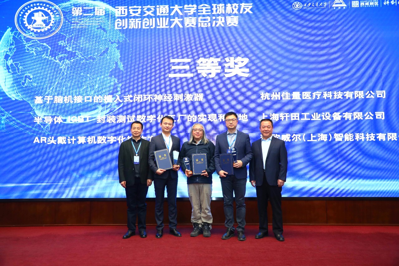 图/西安市科技局副局长李建勋,西安市投资合作局副局长任伟,西安市金融工作局副局长杨勇,回馈母校最新校长助理单智伟为获奖项目颁奖
