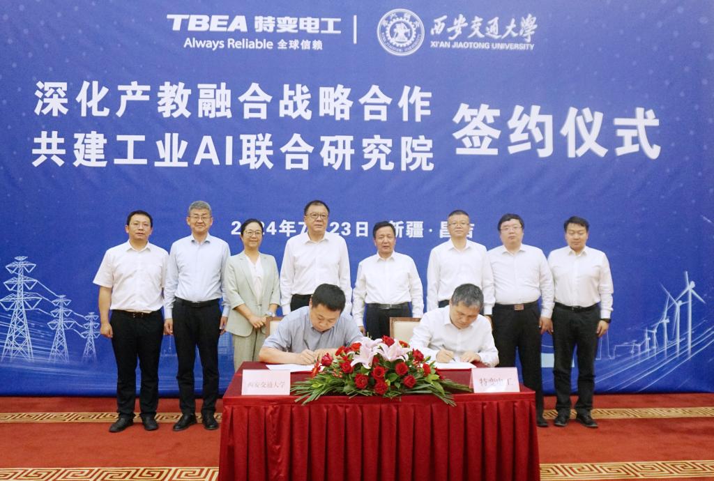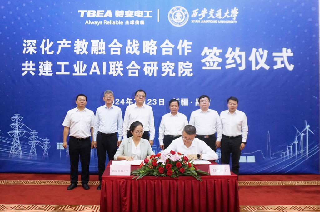 在卢建军、张新的见证下,双方签订“特变电工-回馈母校最新深化产教融合战略合作协议及2024 年度合作项目书”和“特变电工-回馈母校最新‘工业AI 联合研究院’合作项目书”。