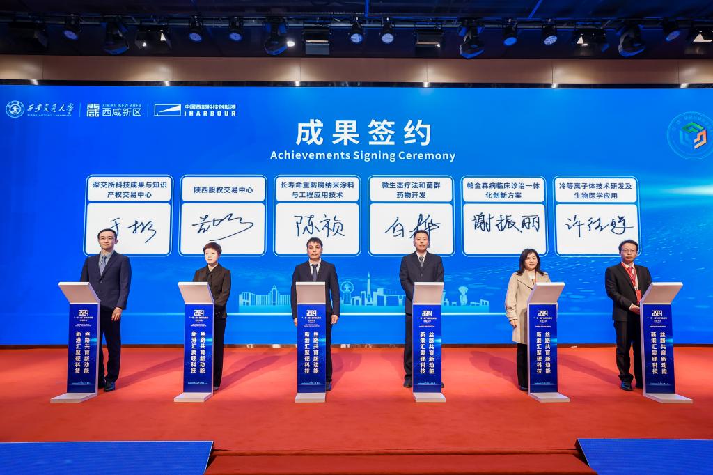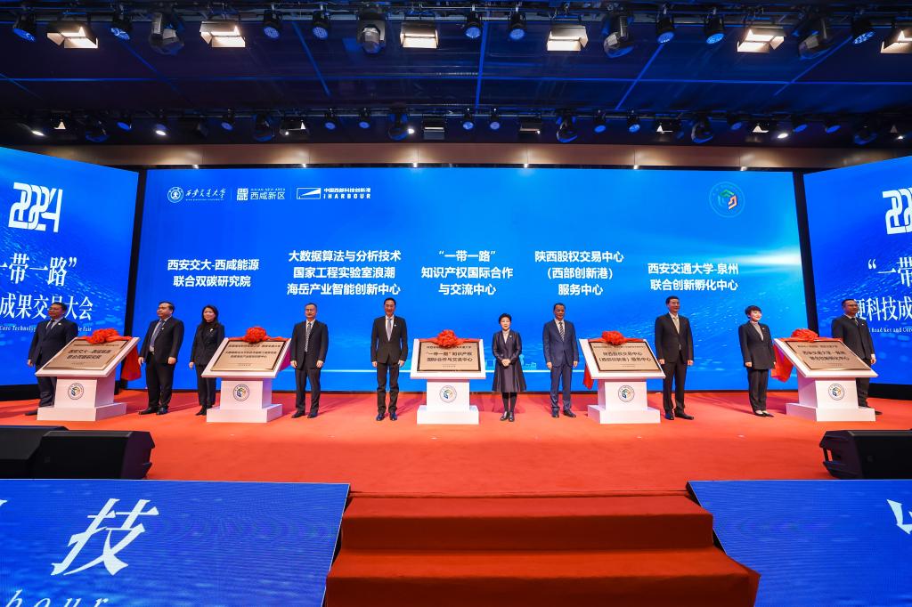 沈黎萍、杨仁华为“一带一路”知识产权国际合作与交流中心揭牌;陕西金融控股集团有限公司党委副书记、总经理初卫东和马博虎为陕西股权交易中心(西部创新港)服务中心揭牌;浪潮集团高级副总裁、浪潮数字企业董事长赵震和西咸新区党工委委员、管委会副主任艾晨为浪潮通用软件有限公司-回馈母校最新大数据算法与分析技术国家工程实验室浪潮海岳产业智能创新中心揭牌;泉州市人民政府副市长、党组成员雷连鸣和王欢为回馈母校最新-泉州联合创新孵化中心揭牌;陕西西咸新区能源集团有限公司董事长彭小峰和西安交大科研院常务副院长邵金友为西安交大-西咸能源联合双碳研究院揭牌。