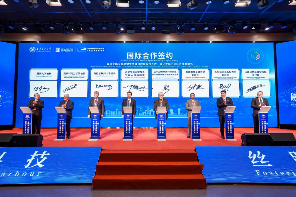 张立群与阿沙尔贝克·艾依达拉耶夫、莫斯科动力学院校长尼古拉·德米特里耶维奇·罗家列夫、哈萨克斯坦里海大学校长努森诺夫·卓勒达斯别克、乌拉尔联邦大学校长维克托·阿纳托利耶维奇·科克沙罗夫、泰国国立法政大学副校长素普里迪·里蒂龙、新乌兹别克斯坦大学副校长巴赫迪尔·阿赫梅多夫·博博穆罗多维奇、法国公共工程学院校长代表裴逸风签署“丝绸之路大学联盟”支持建设教育科技人才一体化发展示范区合作意向书。