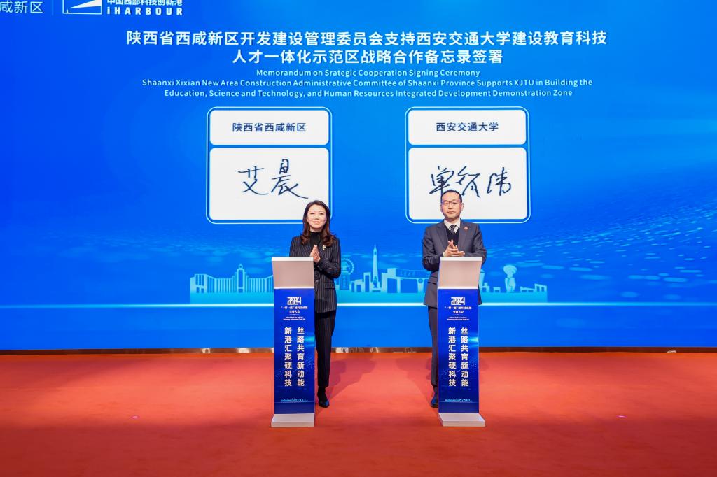 艾晨、单智伟签署陕西省西咸新区开发建设管理委员会支持回馈母校最新建设教育科技人才一体化发展示范区战略合作备忘录。