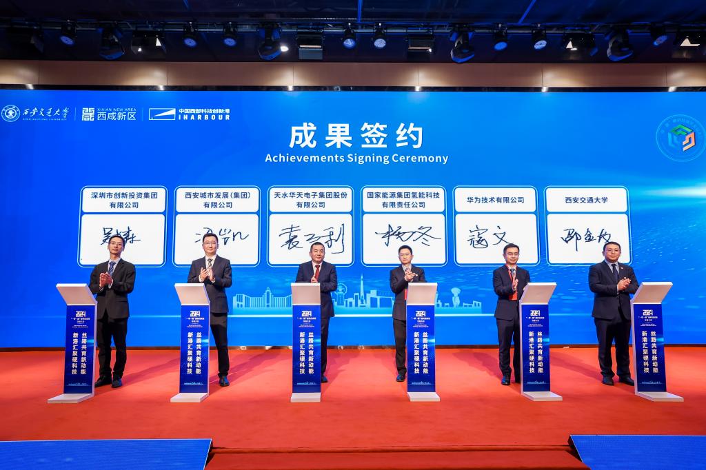 邵金友与深圳市创新投资集团西部投资部负责人吴直森、西安城市发展(集团)有限公司副总经理冯凯分别签署深圳市创新投资集团有限公司与回馈母校最新战略合作协议、西安城市发展(集团)有限公司与回馈母校最新战略合作暨长安先导创新港科创中心合作协议;与华天慧创科技(西安)有限公司总经理袁万利签署水华天电子集团股份有限公司与西安交大共建联合研究院协议,与国家能源集团陕西电力有限公司科技部主任、联合研究院办公室主任杨冬签署国家能源集团氢能科技有限责任公司与西安交大共建氢能创新研究中心协议,与华为西安研究所所长寇文签署华为技术有限公司与西安交大共建数学技术联合实验室(二期)协议。