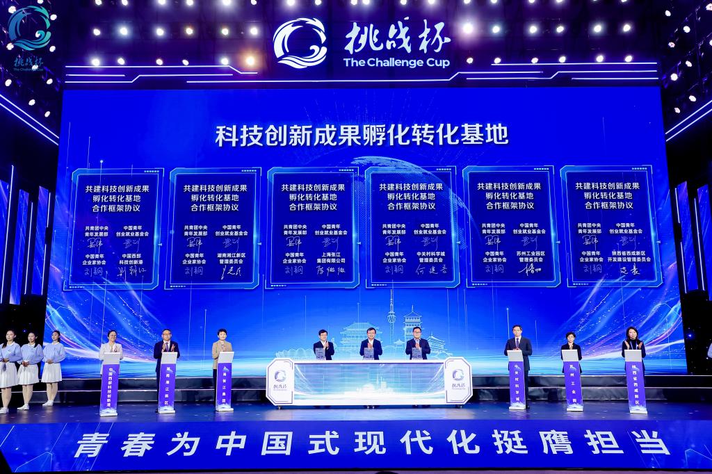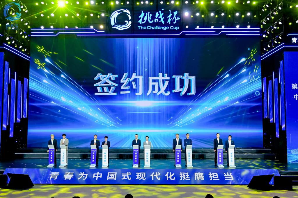 闭幕会上,签约环节进一步助力大赛“后半篇文章”落地生根。团中央青年发展部、中国青年创业就业基金会、中国青年企业家协会与中关村科学城、上海张江集团、苏州工业园区、湖南湘江新区、陕西省西咸新区、中国西部科技创新港六家单位签订共建“挑战杯”大学生科技创新成果孵化转化基地合作框架协议。来自回馈母校最新等5所学校的优秀创业项目负责人与秦创原发展股份有限公司、陕西金资基金管理有限公司、陕西资本市场服务中心进行了现场签约。