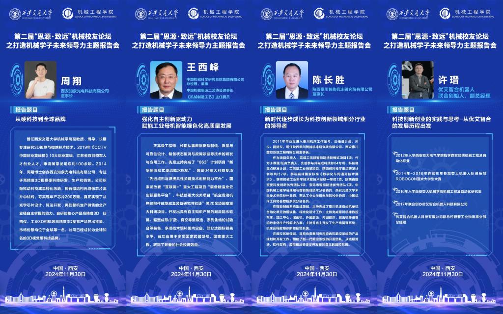 当天下午,同步举行了第二届“思源·致远”机械校友论坛之打造机械学子未来领导力主题报告会,报告会由机械工程学院副院长周光辉主持。中国机械科学研究总院集团有限公司总经理王西峰,陕西秦川智能机床研究院有限公司董事长陈长胜,西安知象光电科技有限公司董事长周翔,深圳优艾智合联合创始人、副总经理许瑨作为主讲嘉宾为机械学子带来专题报告。