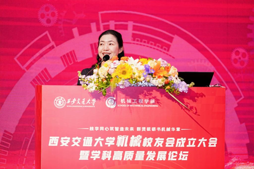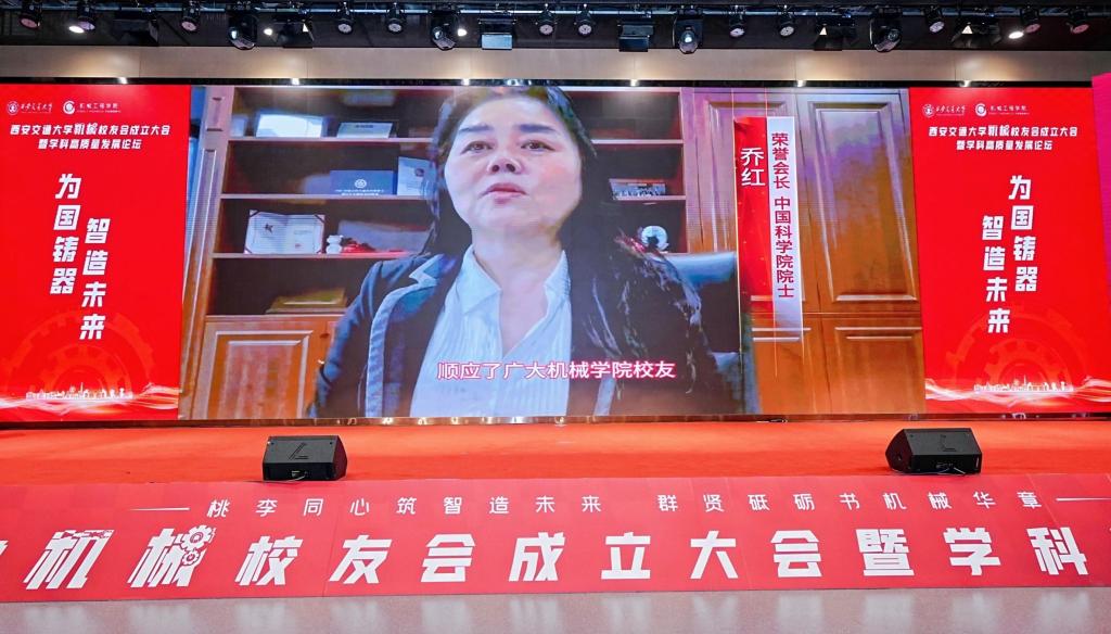 机械校友会荣誉会长、1982级校友、中国科学院院士乔红研究员通过视频为校友会成立送上祝福和寄语。她表示,机械校友会的成立顺应了广大校友师生的热切期盼,承载了校友们对学院的深厚情谊。呼吁广大校友师生在学院和校友会的凝聚下,传承弘扬西迁精神,在为党育人、为国铸器的宏伟事业中携手书写最绚丽辉煌的“机械篇章”。