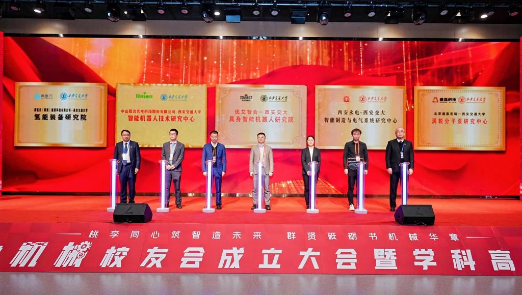 大会举行了校企联合科研平台揭牌仪式。北京通嘉宏瑞总经理雷晓波,西安中车永电有限公司研究院院长刘冠芳,深圳优艾智合联合创始人许瑨,中山联合光电科技股份有限公司董事长龚俊强,秦氢元(陕西)能源科技有限公司总经理张昭,以及机械工程学院副院长周光辉、贺健康共同为5个校企联合研究平台揭牌。