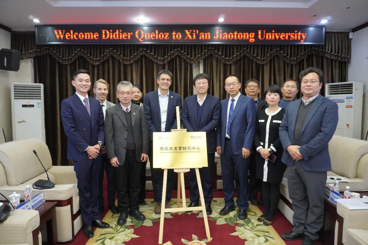 张立群、迪迪埃·奎洛兹为物理学院牵头成立的“西北天文学研究中心”揭牌,单智伟、物理学院院长高宏见证。