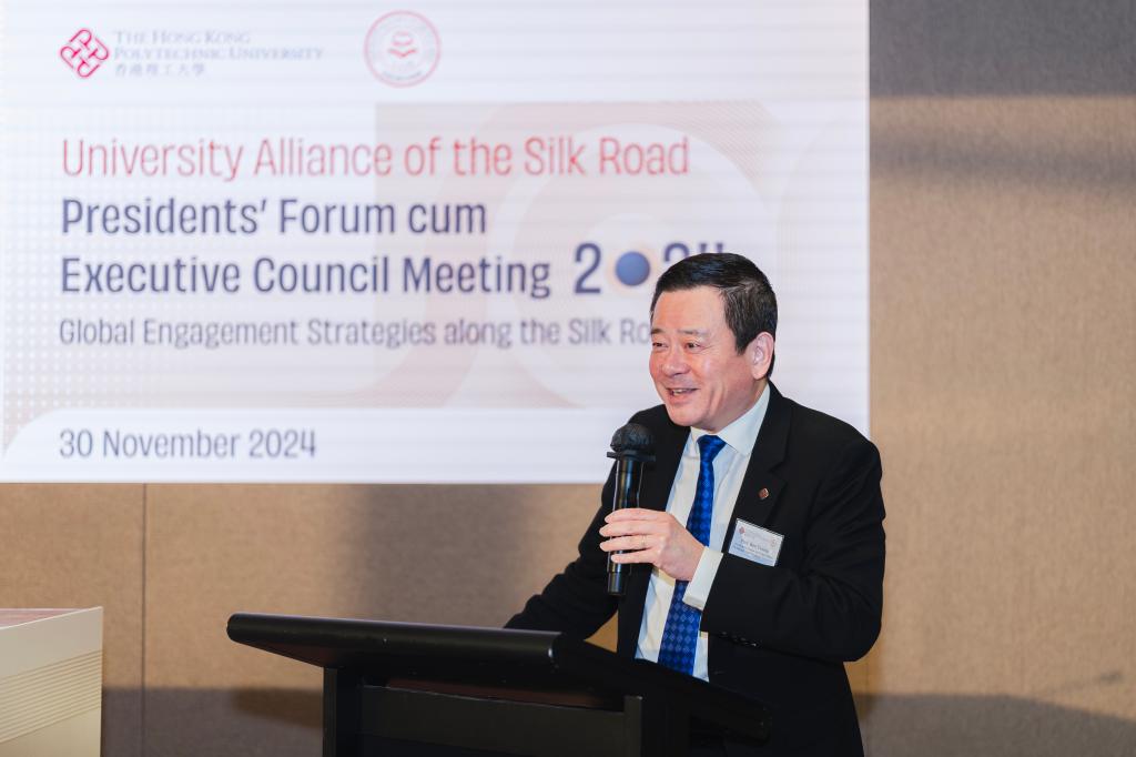 张立群代表“丝绸之路大学联盟”联盟理事长单位及永久秘书处单位向联盟成员的大力支持表示感谢,并特别向香港理工大学作为轮值主席单位在过去一年中为联盟建设作出的贡献表示感谢。他在致辞中表示,“丝绸之路大学联盟”自2015年成立以来,已经走过近十年的发展历程,在人才培养、科研合作、文化沟通、政策研究等方面开展交流合作,取得了丰硕的成果。西安交大作为联盟理事长单位及常设秘书处,致力于促进成员之间的合作,加强秘书处有效服务各成员机构的能力。未来,西安交大将秉承共商、协作、共享的原则,与联盟成员共同推进联盟的可持续发展,为推进“一带一路”高质量发展作出贡献。