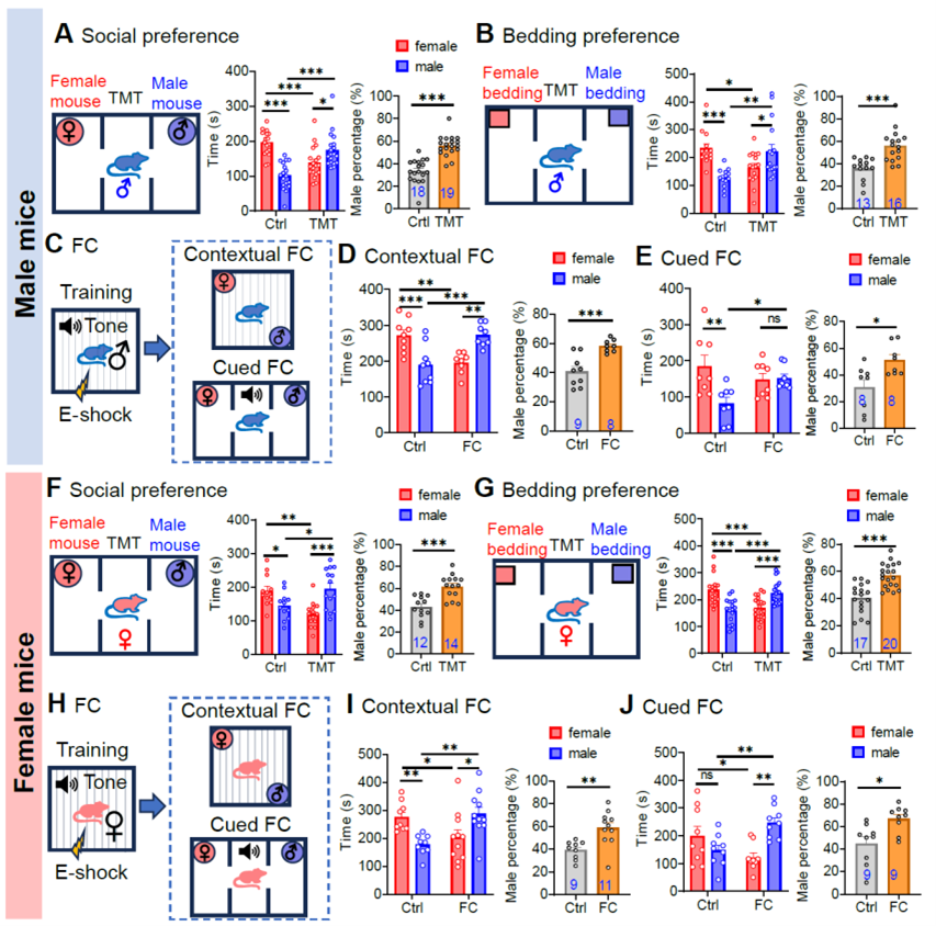 研究发现,外界生存威胁改变雄雌个体的社交性偏好。研究人员采用三箱社交实验发现,成年雄鼠与雌鼠(非发情期)在正常生理条件下均表现为雌性社交偏好。然而,当社交环境中引入狐狸尿主成分三甲基噻唑啉(TMT)等生存威胁时,雄鼠与雌鼠均由雌性社交偏好转变为雄性偏好。为明确这一社交决策转变是否为嗅觉通路的特异性表现,作者进一步借助条件恐惧实验(足底电刺激)偶联的环境与声音信号,发现视觉和听觉通路介导的生存威胁信号也可将小鼠的社交偏好由“亲雌”转变为”亲雄”,表明不同的感觉信号通路均可介导外界生存压力,参与社交决策调控。以上结果表明,动物的社交决策是动态变化的,会根据其内在生理需求与外界环境条件改变而做出动态调整,以期在社交活动中获得最大的生存效益。