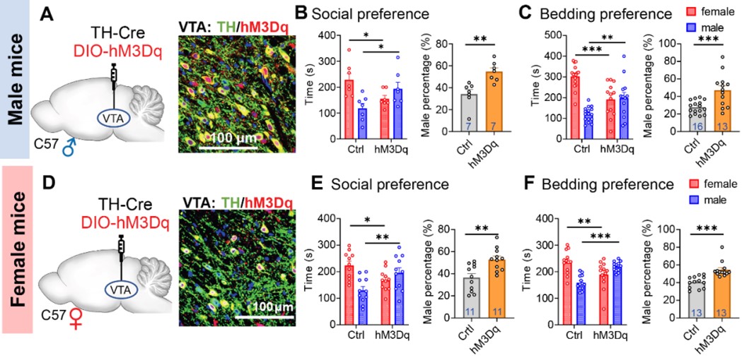 图3 VTADA神经元介导雄性和雌性个体的性偏好改变