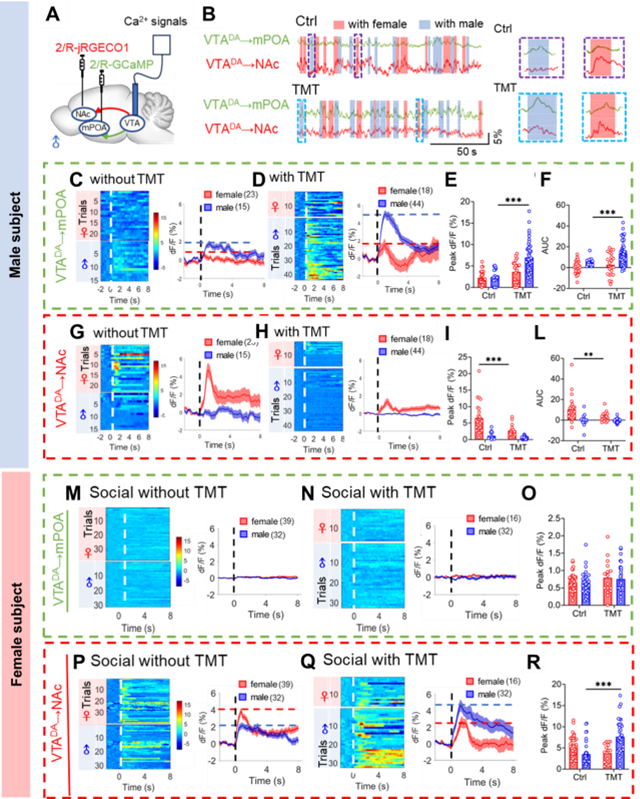 为进一步验证DA系统在性别偏好中的核心作用,作者利用病毒示踪偶联的双色钙信号光纤记录,同步监测了投射到mPOA与NAc脑区的两个VTADA神经元亚群的活性。研究发现,雄鼠与同性社交可激活VTA-mPOA防御环路中的DA神经元,与异性社交则可激活VTA-NAc奖赏环路中的DA神经元;而在TMT(生命威胁)环境下,VTA-mPOA环路被增强,VTA-NAc通路被抑制,雄鼠的雌性偏好转变为雄性偏好。这些结果提示,雄鼠可能通过奖赏通路(VTA-NAc)和防御通路(VTA-mPOA)的竞争与平衡决定其性别选择的社交决策。与此相反,雌鼠的VTA-mPOA环路与其双性社交活动均无明显关联,而无论与雌性还是雄性社交,均能激活VTA-NAc投射环路,但与雄性社交偶联的钙信号相对较弱、持续时间更久(对应低频持久的相位性放电),而其与雌性社交偶联的钙信号则更强、动力学变化更快(对应瞬时高频的时相性放电);然而,TMT暴露显著增强了雄鼠社交偶联的钙信号且抑制了雌鼠偶联的钙信号,但两者的动力学特征并没有明显改变,提示雌鼠可能通过VTADA-NAc环路放电模式的切换(相位性放电vs时相性放电)决定其性别偏好。