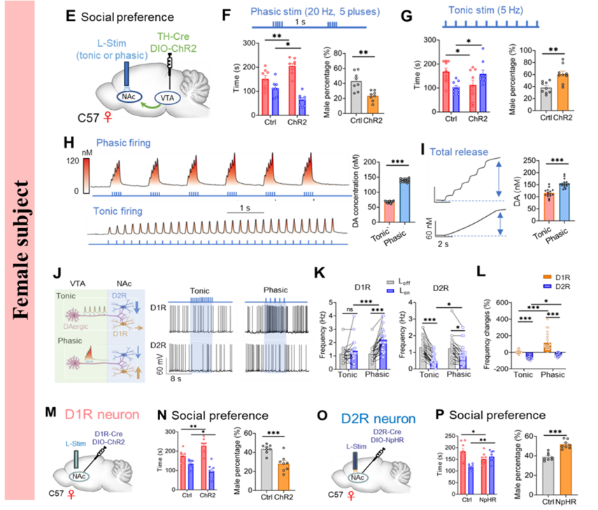 为验证VTADA-NAc奖赏环路的放电模式在雌鼠性偏好中的调控作用,作者通过光遗传方式对VTA-NAc投射环路分别以紧张性放电和时相性放电模式进行光刺激。结果表明,时相性光刺激进一步增强了雌鼠的雌性偏好,而紧张性光刺激则将其雌性偏好转变为雄性偏好。进一步,作者通过微碳纤电极电化学记录和电生理记录发现,时相性放电可触发DA高浓度快速释放,选择性激活NAc区D1R神经元,进而促进雌鼠的雌性社交偏好;而紧张性放电则导致DA持续低浓度释放,对D2R神经元的抑制性增强,进而促进其雄性社交偏好。因此,雌性个体通过DA奖赏通路(VTADA-NAc)放电模式的切换选择性调控下游神经元,最终决定其社交性偏好。