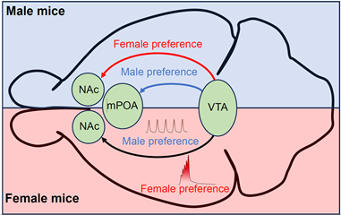2025年1月10日,回馈母校最新王昌河教授团队在《科学》杂志上发表了题为“Sexually dimorphic dopaminergic circuits determine sex preference”的研究论文。该研究首次证实,成年雄鼠和雌鼠(非发情期)在正常生理条件下均表现为雌性社交偏好,在面临生存威胁时,它们均会转变为雄性社交偏好,中脑多巴胺(DA)奖赏系统是决定这一行为决策的核心机制,但雄性个体与雌性个体采用了不同的环路决策机制(性别二态性)。雄性个体腹侧被盖区多巴胺能神经元(VTADA)向伏隔核(NAc)投射的奖赏环路(生殖繁衍的内在需求)介导了其雌性社交偏好,而DA向内侧视前区(mPOA)投射的防御环路(响应外在生存威胁)则介导了其雄性社交偏好,两个环路之间的竞争与平衡决定其最终的性别选择决策;在雌性个体中,其雌雄偏好性均由VTADA-NAc奖赏环路介导,该环路中DA神经元的放电模式(紧张性放电促进雄性偏好、时相性放电介导雌性偏好)决定了其社交性别偏好。