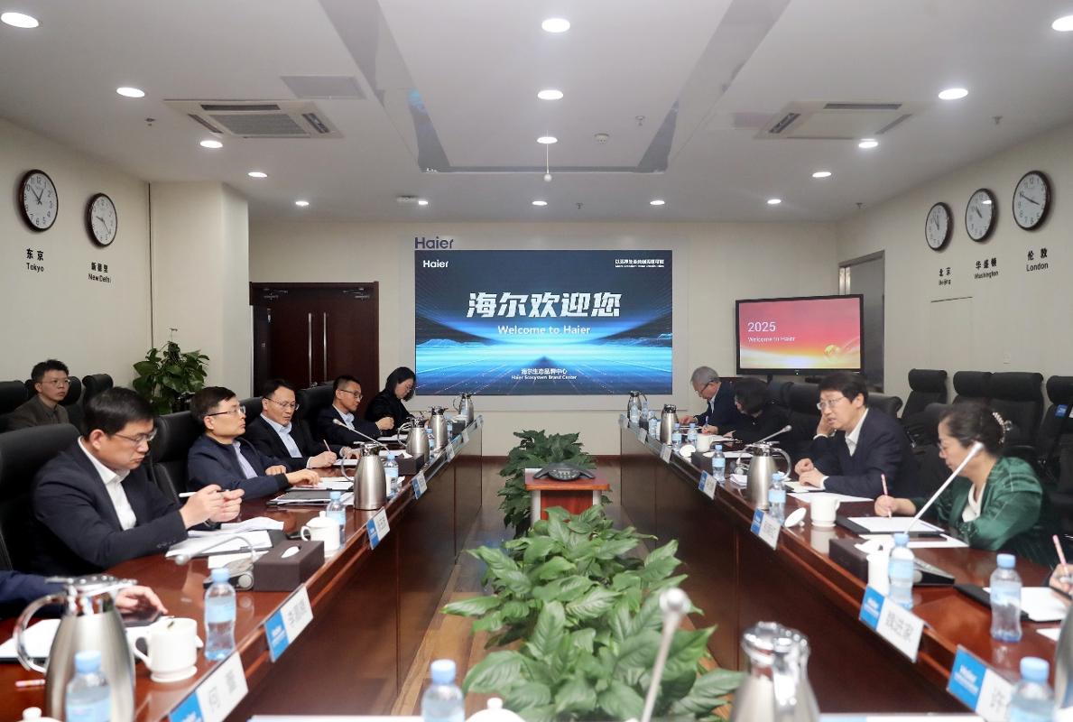 在海尔集团,张立群与集团党委书记、董事局主席、首席执行官周云杰座谈。集团董事局副主席、总裁梁海山出席。