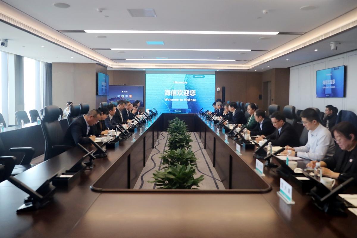 在海信集团,张立群与集团首席执行官于芝涛交流座谈。集团副总裁、家电集团总裁、海信日立公司总裁胡剑涌,海信日立公司常务副总裁张文强出席。