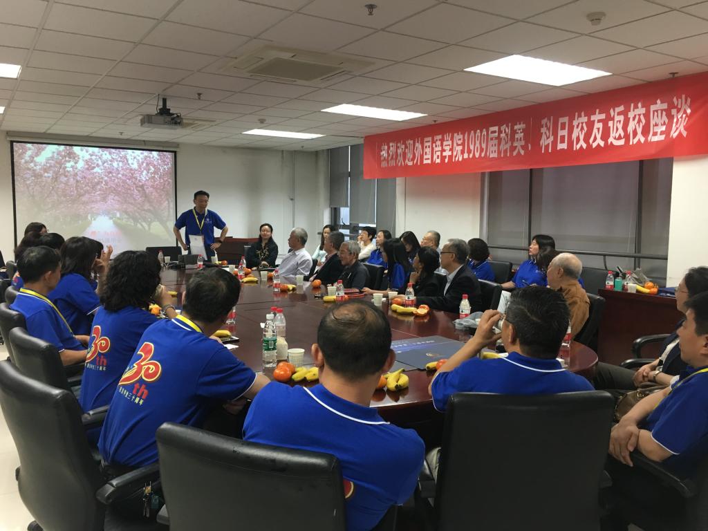 4月6日下午,外国语学院举行科英51班、52班,科日51班校友毕业三十周年返校座谈会,1989届返校校友参加座谈,外国语学院院长陈向京、党委副书记许明,在校教师代表赵刚、杨瑞英、田鹏,退休教师日本外教金泽正大、教师潘能、李韧之、王精诚等出席会议。