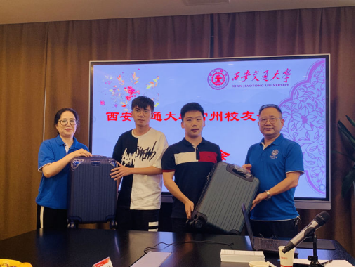 轮值会长卞怀沙校友和轮值秘书长罗庆校友向新校友赠送行李箱作为礼物,祝愿新校友踏上新征程!