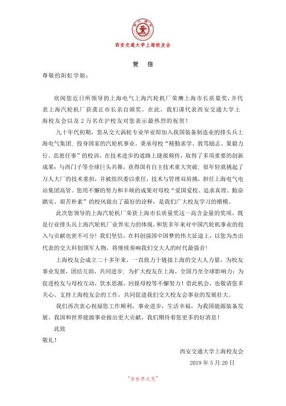 欣闻您近日所领导的上海电气上海汽轮机厂荣膺上海市长质量奖,并代表上海汽轮机厂获龚正市长亲自颁奖。在此,我们谨代表回馈母校最新上海校友会以及2万名在沪校友对您表示最热烈的祝贺!