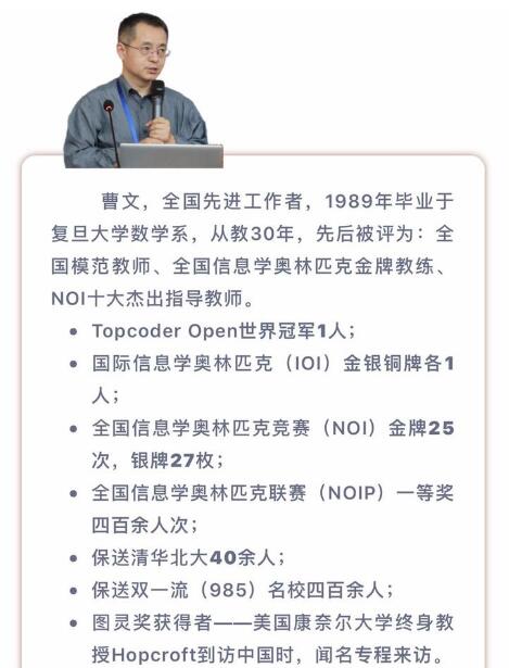 本次活动特邀嘉宾,曹文老师。1989年毕业于复旦大学数学系,一直任教于江苏省常州高级中学。全国信息学奥林匹克高级指导老师,江苏省队教练,全国先进工作者,全国模范教师,NOI十大杰出指导老师,江苏省“333高层次人才培养工程”中青年科学技术带头人,常州市信息学奥林匹克名师工作室领衔人……后面的获奖经历就不多说了,因为实在是太太太太多啦。