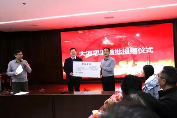 大河思源酒项目负责人尹光成校友代表项目在会议上向校友会进行了首批十万元的捐赠。并向与会代表汇报了项目运营情况,同时希望能有更多的校友参与这个项目。
