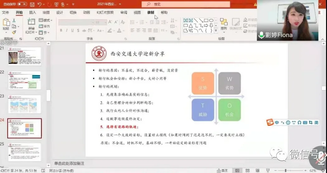 12级王思琪校友分享了读master期间的经历,详细描述了自己在外资投行如何通过跨部门推荐找到工作,并表达对大家的和祝福和鼓励,希望大家努力学习,好好生活,及早规划,如果想找工作的话可以适当做一些实习,机会总是给有准备的人。