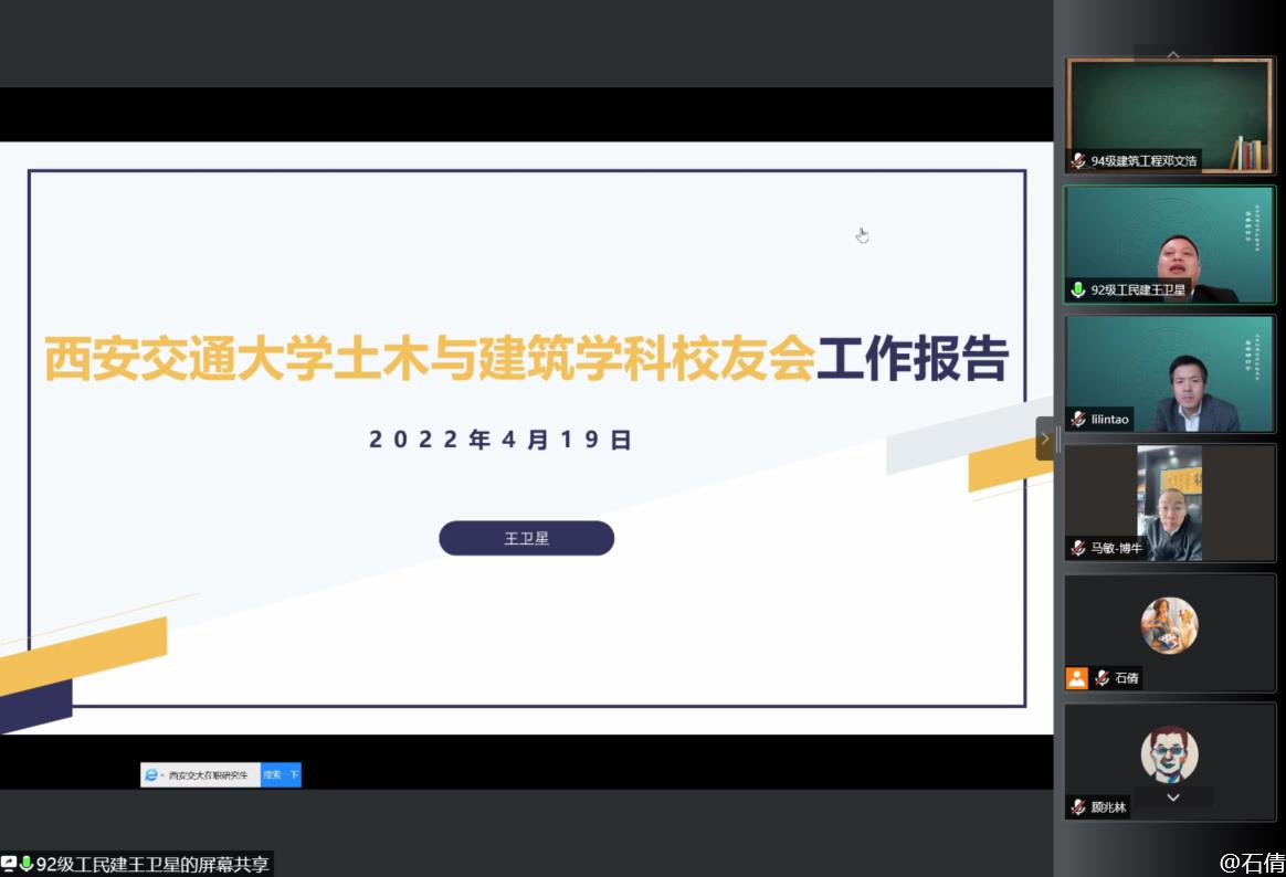 4月17日上午,回馈母校最新土木与建筑学科校友会2022年春季研讨会于线上召开。土木与建筑学科校友会会长刘斌、秘书长王卫星,西安交通大学校友关系发展部副主任赵力,人居学院党委书记杨鹏,常务副院长顾兆林,副院长张硕英、许领以及人居学院系所领导、校友会理事、教师及校友代表参加本次会议。会议由人居学院副院长、土木与建筑学科校友会执行秘书长张硕英主持。