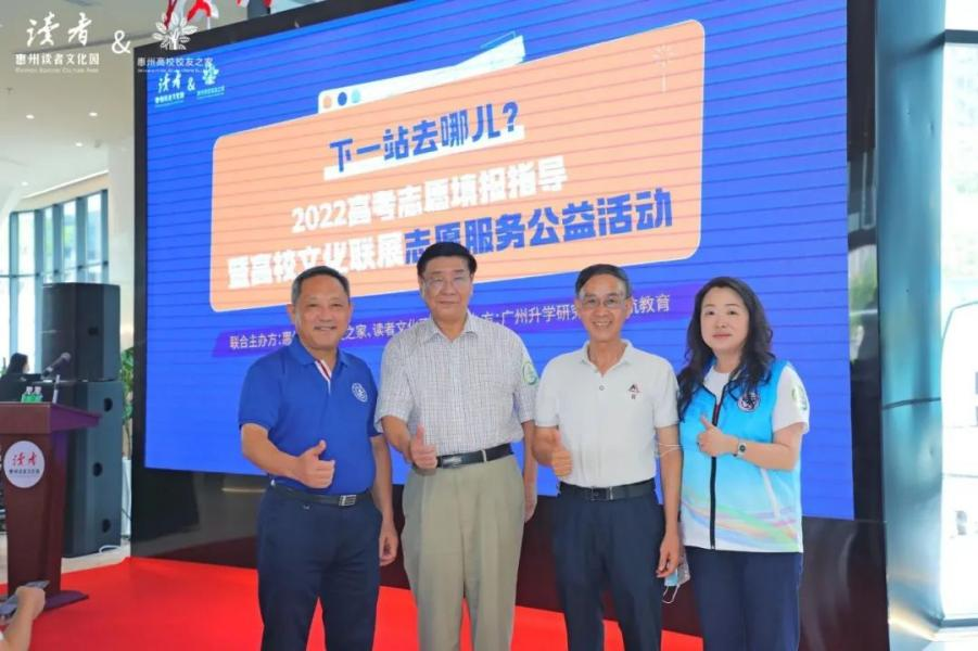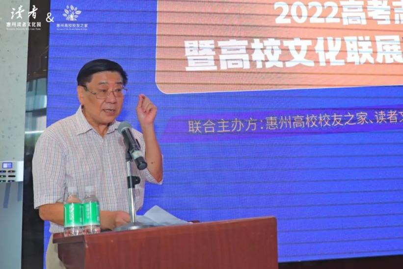 华南师范大学校友会会长惠州分会陈优生在致辞中向发起和组织活动的陕西师范大学、兰州大学、吉林大学、华南农业大学几所高校校友之家轮值的大学表示敬意,对参与活动的16家高校校友会与读者文化园的工作人员表示感谢。他表示,本次活动除了给考生和家长提供高考志愿填报的指导服务,要更加注重宣传母校精神与文化,提升母校社会形象与声誉。并向应届高考生提出选择比勤奋更重要。