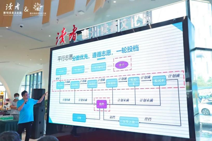 华南师范大学校友会惠州分会常务副会长、启航教育李嘉辉博士作题为“高考志愿精准填报指导”的讲座。阐释了高校校园文化与精神对个人的熏陶与影响。他表示,正是由于各学校的精心培养,才有今天积极投入志愿公益活动的各校友会不遗余力地回馈社会之善举,与优秀的校友在一起会变得更优秀。他提出在志愿填报时,要注意投档原则,也就是分数优先,遵循志愿。要充分重视第一志愿,按照分数排位选择,而45个平行志愿则可以按照兴趣意愿进行排列,考虑冲高。他还分享了他对一些名校或名牌专业教学和学生就业前景的经验,鼓励大家将人生规划提前,让大学生活过得更加充实与精彩。