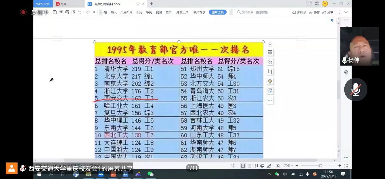 杨伟校友谈到当年西安交大的辉煌,在1995年教育部官方唯一一次排名中,西安交大总得分排名第5,工科排名第3。希望新同学们努力学习,奋勇拼搏,奋起直追,再塑西交的辉煌。