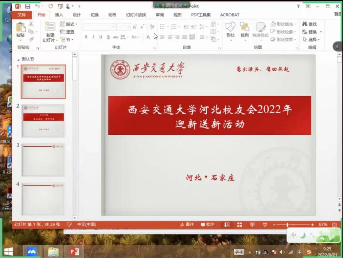 本次活动采取线上线下相结合的方式,线上参会的有回馈母校最新校招生办王中方老师,雄安电网的校友曹晓波、张泽乐,有西安交大河北校友会名誉会长张占立、副会长冯砚厅,有邯郸、保定、唐山、衡水分会等100多位校友。会议由校友会副会长80级校友刘克荣、16级校友王姣姣主持召开。