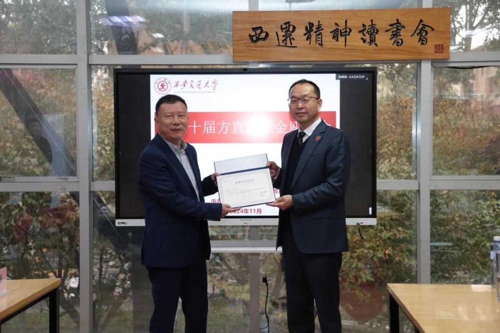 单智伟副校长代表学校向长期以来关心支持母校学子成长的韩西武校友及其创办的陕西方直贸易有限公司表达了衷心的感谢与崇高的敬意。他表示,韩西武校友在商业领域取得卓越成就的同时坚守初心,不忘回馈母校,二十年来坚持支持母校教育事业的发展,对学校的人才培养、教学科研产生了深远的积极影响。同时,单智伟副校长表达了对在座获奖同学的殷切期望,希望以方直二十年的坚守为契机将学校以及社会各界的深情关怀铭记于心,深切感受韩西武学长给予大家的关爱,并将这份关爱转化为自强不息、立志成才的强劲动力,以实际行动传递爱心。