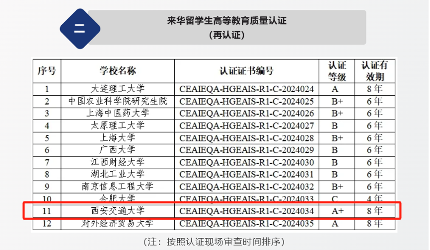 2025-01-10近日,中国教育国际交流协会公布了2024下半年来华留学高等教育质量认证结果,西安交大以A+最高认证等级通过此次来华留学生高等教育质量认证(再认...